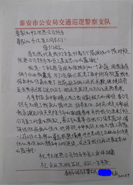 泰安市交警支隊一位家有兩個重病患者的職工深處困境,我公司得知其情況后,免除了該職工家今年冬季的采暖費,并在全公司進行一次獻愛心捐款活動。