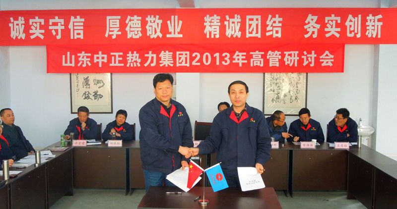 山東中正熱力集團2013年高管研討會于2013年3月29日上午8:00在集團總部三樓會議室召開,會期三天。會議由集團公司董事長李廣法主持,集團公司各部門、各權(quán)屬公司領(lǐng)導參加了會議。會議上,各單位、各部門匯報了2012年度工作報告和精細化管理實施方案;總經(jīng)理蔣俊卿作年度工作報告,公布兌現(xiàn)2013年度年薪,與各獨立核算單位和部門簽訂2014年度安全、經(jīng)營目標責任書;討論通過了集團中長期規(guī)劃(2014-2023年度)及《全面推進集團精細化管理,為中正品牌和效益的提升而努力》、《集團資本運營管理實施意見》、《關(guān)于完善市場體系建設(shè)的實施意見》三個報告。